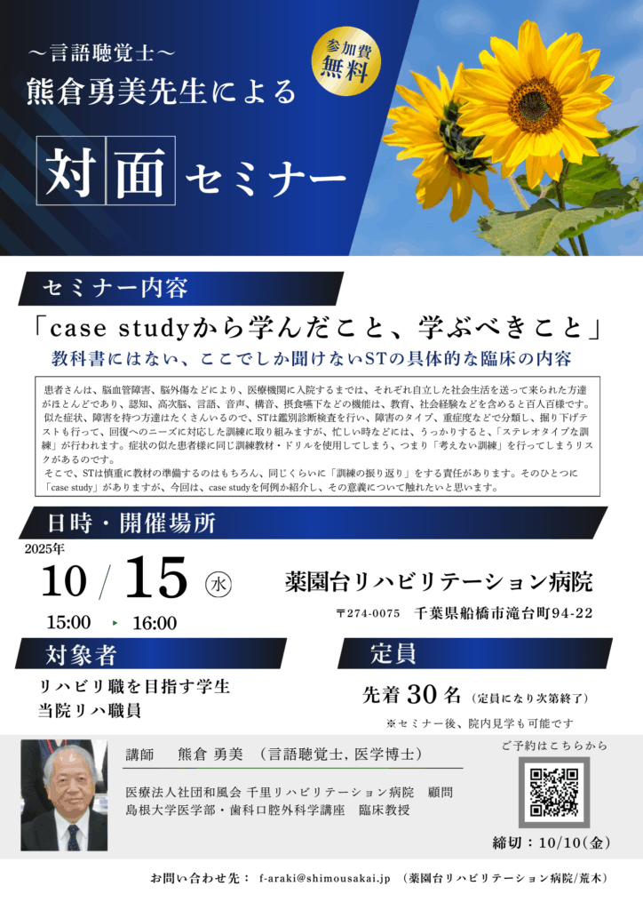 ~言語聴覚士~熊倉勇美先生による対面セミナーを開催致します。(参加費無料)